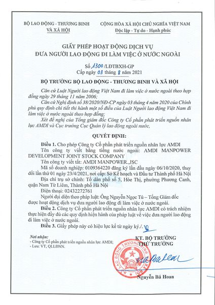 After a thorough and methodical preparation process, on August 3, 2021, AMDI Human Resources Development Joint Stock Company (AMDI Manpower) - a member of AMDI Group - was officially granted a service operation license. sending workers to work abroad.